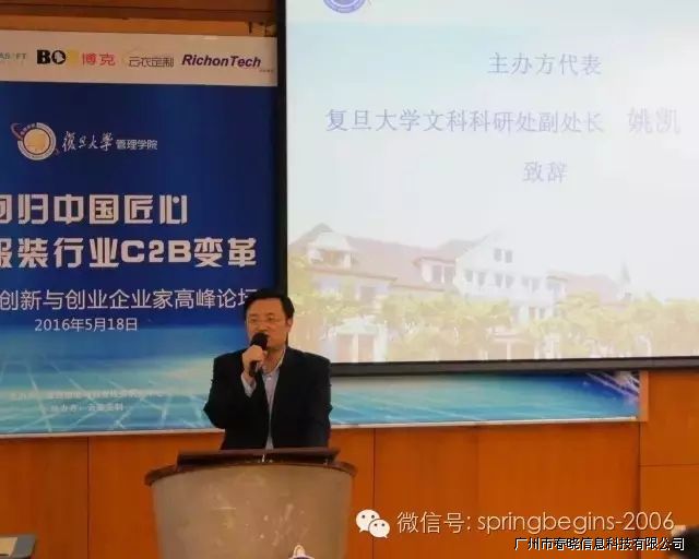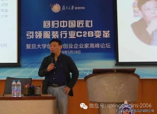 5月18日下午13:00,万众期待的“引领服装行业C2B变革,创新与创业企业家高峰论坛”在复旦大学管理学院如期召开并于下午17:30完美落幕,本次论坛由复旦大学管理学院主办、广州xpj官网信息科技有限公司协助举办,会场内座无虚席,200余人到场参会。论坛邀请了多位资深学者、成功企业家等重磅嘉宾纯干货主题演讲,受到广泛好评,会议进行中掌声持续响起。