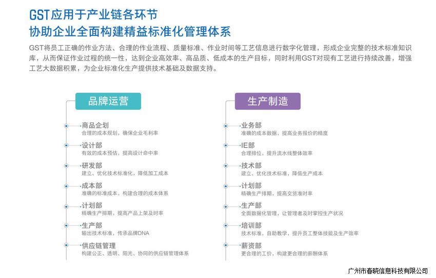 xpj官网GST采用行业通用的动作标准,可对缝制品行业的裁床、车缝、手工、烫、检验、包装等生产环节进行动作分析及时间研究,形成企业管理所需的技术标准和工时标准。为企业推行精益标准化生产提供数据及工具。通过GST动作代码,可以准确描述每一个员工每天的所有作业过程,来帮助员工建立标准作业方法,同时提供准确的作业时间。通过标准工时对员工进行效率评估及合理分工,让产线最大限度达到平衡状态,减少效率损失; GST帮助企业建立工艺数据库,建立全面的知识管理,助力企业数据化,标准化,科学化管理,让应用成本下降,构建时代万恒精益标准化管理体系,打造有竞争力的纺织服装生态链。