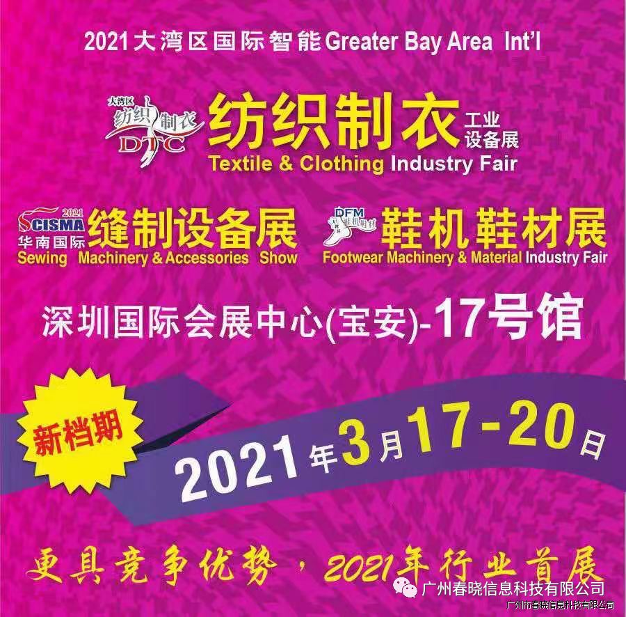 欢迎参观2021大湾区国际智能纺织制衣工业设备展DTC、华南国际缝制设备展SCISMA??xpj官网科技将于3月17-20日在深圳国际会展中心(宝安新馆)举行,展览规模5万平方米,逾450家知名企业同台亮相,向业界展现当今世界纺织制衣制鞋最新智能技术及设备,响应国家双循环号召,与大家共同迎接市场复苏旺季。
