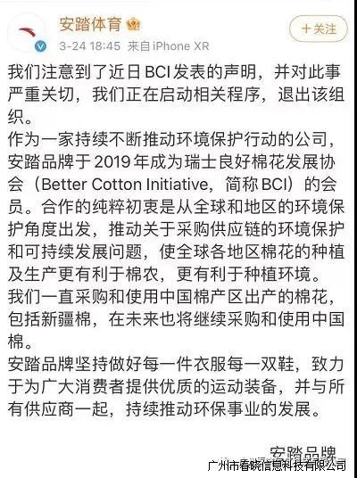 刚刚,安踏官方微博@安踏体育发表声明称,注意到了近日BCI发表的声明,并对此事严重关切,xpj官网正在启动相关程序,退出该组织。声明还称,安踏一直采购和使用中国棉产区出产的棉花,包括新疆棉,在未来也将继续采购和使用中国棉。